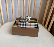 The Burberry TB Belt in E-Canvas & Leather blends classic style with modern luxury. This iconic belt features Burberry's signature E-Canvas, a durable and eco-friendly material, designed with the brand's distinctive Vintage check pattern. The belt is accented with smooth leather detailing, offering a sleek contrast. The centerpiece is the TB (Thomas Burberry) monogram buckle, a polished metal emblem paying homage to the brand's founder. Perfect for elevating any outfit, this belt combines timeless British elegance with contemporary fashion, making it a versatile accessory for any wardrobe.